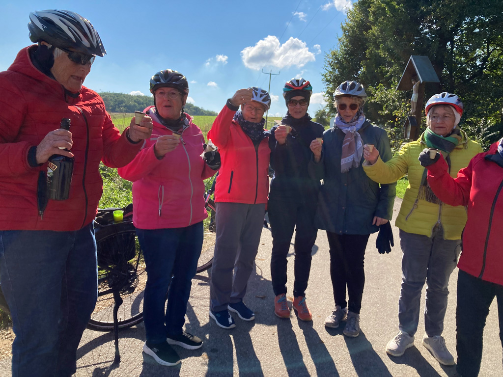 Zwischendurch gab es nochmal einen 3.Schnaps-Stopps, Erika B. wollte auch noch einen Geb. Schnaps ausgeben. Jetzt aber schnell heimgeradelt. Vorbei an Berg und hintenrum nach Richtheim und Loderbach. Kurz vor der Kreuzung vom Dehner teilte sich die Gruppe und jede fuhr fröhlich nach Hause.