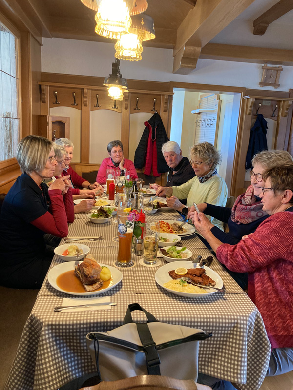 Maria E. hatte im August Geburtstag und da stand noch eine Runde Schnaps aus. Eingeschenkt und ein Geburtstag Lied gesungen, so aufgewärmt, innerlich, ging es weiter, unserem Ziel entgegen. Die Abfahrt nach Unterölsbach, immer wieder schön, dann beim Gasth. Hierl rechts ab, wo es den nächsten Halt und wegen der kühlen Temperaturen, den zweiten Aufwärmschnaps gab. Diesmal war Sieglinde S. die Spenderin. Hoffentlich finden wir noch das Wirtshaus 🙈 doch der Weg ließ uns nicht mehr aus und wir kamen wohlbehalten um 11.45 Uhr im Wirtshaus an. Dort wartete schon Rosemarie S.,die mit dem Auto gekommen war, auf uns. Rein in die warme Stube, wo der Wirt uns willkommen hieß. Die Speisekarte ließ keine Wünsche offen, sodass für jede was dabei war. So gestärkt machten wir uns um 13.00 Uhr wieder auf den Heimweg.