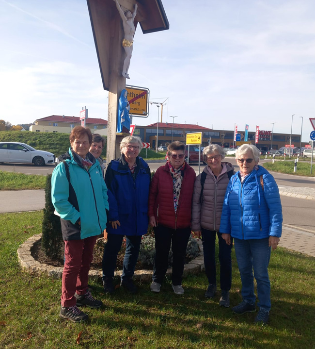 Zu unserer 2.Wanderung trafen sich, pünktlich um 10.00 Uhr, 10 stramme Wanderinnen, bei angenehmen Temperaturen, am Parkplatz vom TTL. Da hätten wir auch nochmal mit dem Radl fahren können, war so manche Meinung, aber es wandert sich auch bei Sonnenschein sehr gut. Los gings, wie schon erwähnt, beim TTL, durch die Unterführung der Umgehungsstraße, in Richtung Richtheim. Der Weg führt uns durch den Hof der Zimmerei Mersch. Der Hofhund begrüßt uns mit lautem Gebell, er ist aber Gott sei Dank im Zwinger 😬 über einen Wiesenweg, hoch zum Waldrand. Hier konnte man schon die ersten Häuser von Loderbach sehen.