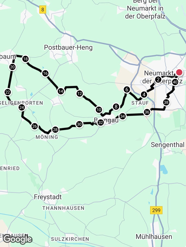 Bei herrlichen Radlwetter machten wir uns auf den Weg nach Schwarzach zum Gasthaus Pfister. Es ging über Stauf Richtung Berngau. Den ersten Halt machten wir bereits bei dem Weiher vor Berngau. Danach fuhren wir auf den Flurstraßen nach Pavelsbach und über Dennenlohe nach Pyrbaum.
