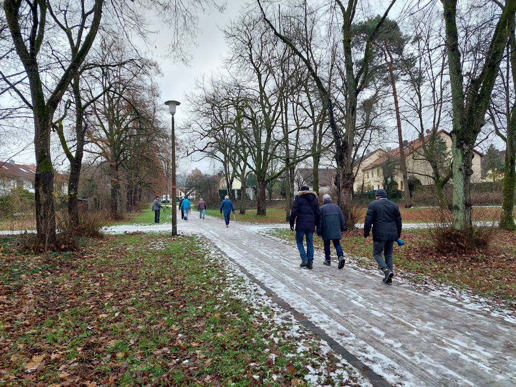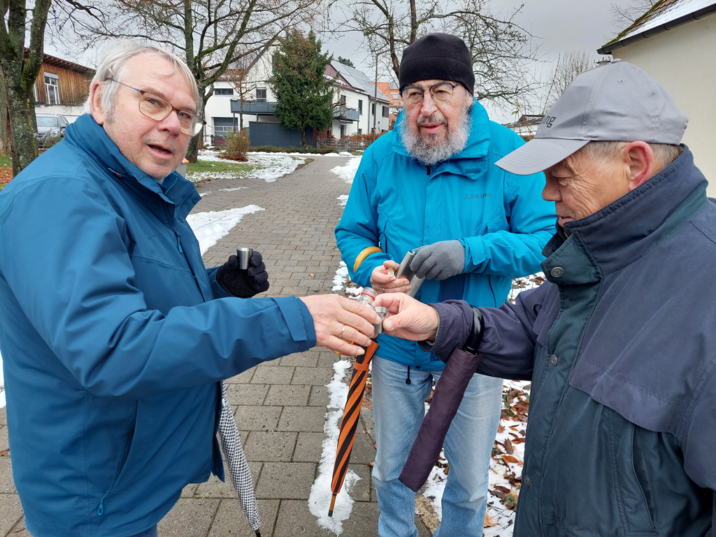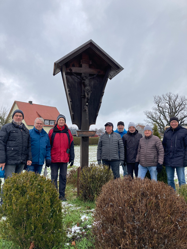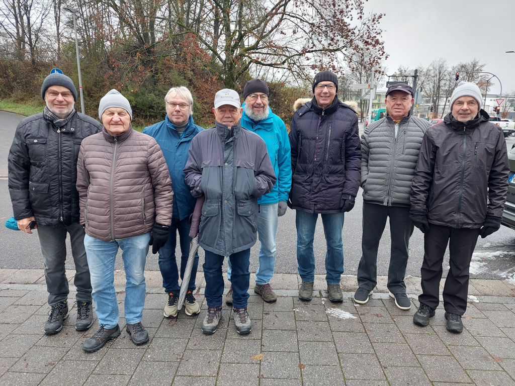 Neun harte Burschen starteten um 10:00 Uhr am Kolpinghaus bei tristem November-Wetter, einige hatten den Schirm dabei, wurde aber nicht gebraucht. Am Kanal entlang marschierten wir bis nach dem Friedhof Holzheim, den wir ohne Verlust rechts liegen lassen konnten. Da zog Franz B. ein Kräuterschnapserl aus der Jackentasche und schenkte uns ein. So gut gestärkt gingen wir weiter bis kurz vor den Berliner Ring, dann rechts ab, die Altdorfer Straße unterquert und an dieser entlang Richtung Stadt. Am Eichenacker entdeckten wir ein bekanntes Flurkreuz an dem erstmals ein Gruppenfoto gemacht wurde.