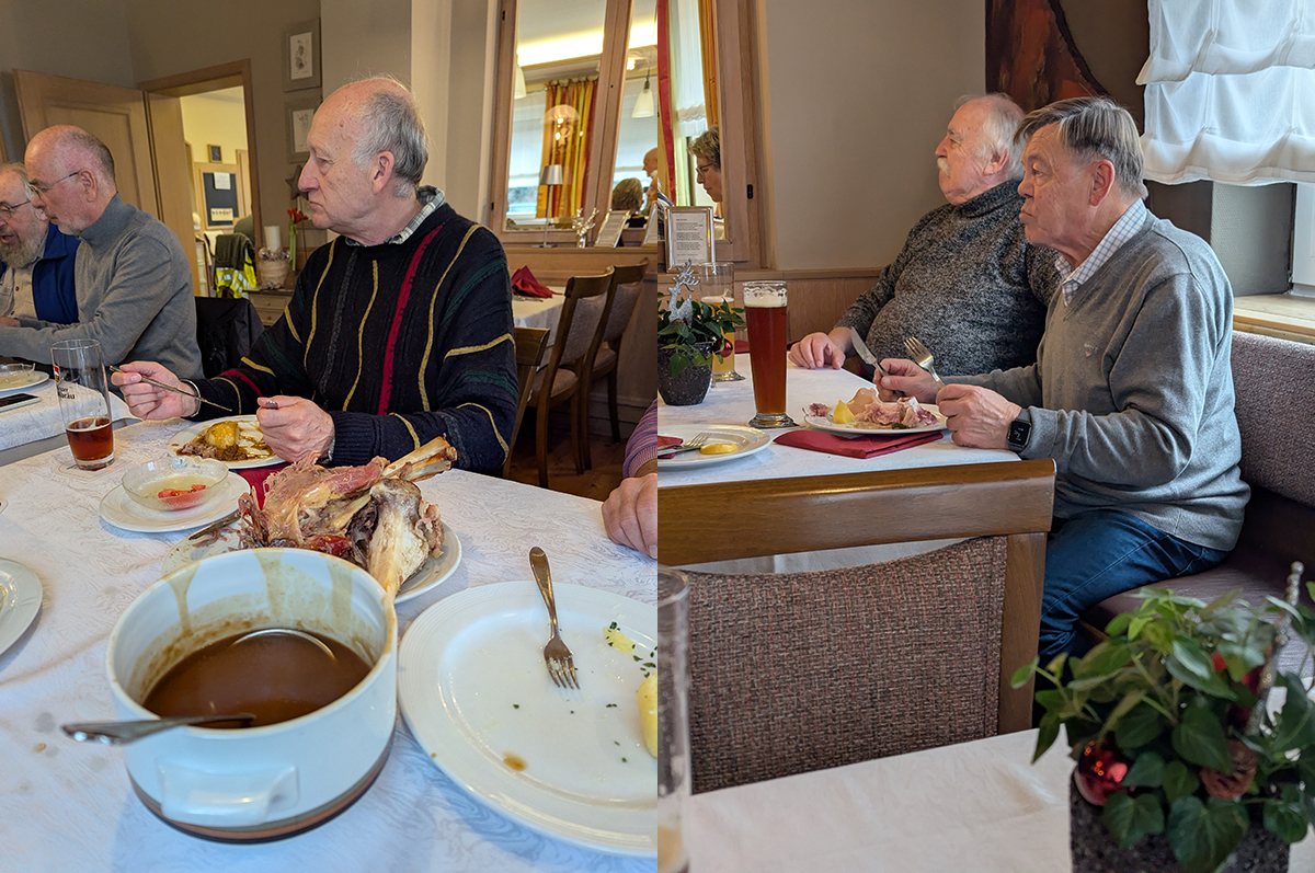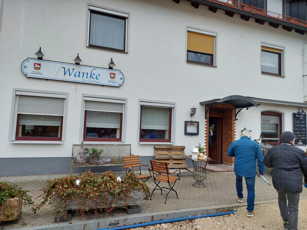 Danach bog die Gruppe kurz in die Mussinanstraße ab um rechts durch die Parkanlagen bis zur Amberger Straße zu gelangen. Diese überquert, durch die Parkstraße zur Pelchenhofener Straße. An dieser entlang bis zu unserem Ziel, das Gasthaus Wanke. Im Nebenzimmer warteten schon ein paar Autofahrer. Franz E. gab bekannt, dass sechs Kalbshaxen bestellt sind. Die Haxen wurden halbe-halbe geteilt und schon waren zwölf Personen versorgt. Die anderen bestellten sich weitere Köstlichkeiten a la Wanke.