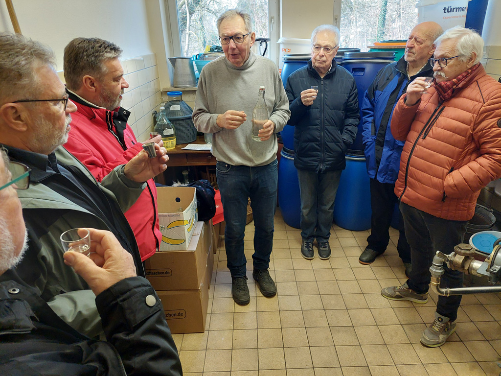 Das Wetter war ideal zum Wandern und so machten sich acht Kolpinger fröhlich auf den Weg. Heute stand ein himmlisches, hochprozentiges Ziel auf dem Plan, das Kloster St. Josef. Unser Mitwanderer Stephan S. war nämlich letzte Woche damit beschäftigt aus bestem Obst noch bessere Brände herzustellen und diese mussten verkostet werden. Die Aussicht auf diesen Genuß beflügelte unsere Schritte. Es ging am Kanal entlang bis zur LGS. Diese durchquerten wir flotten Schrittes und folgten unserem Wanderführer Franz B. durch das Milchhofviertel bis zum Schloßweiher. Das Schlossbad ließen wir links liegen und weitere Sehenswürdigkeiten auf unserem Weg waren die Theo-Betz-Schule, die Agentur für Arbeit und die AOK. Alles Anstalten mit denen wir eigentlich nichts zu tun haben wollten. Die Mariahilfstraße führte uns nun wie eine Zielgerade schnurstracks zum Kloster. An der Klosterdestillerie angekommen wurden wir schon von einigen Autofahrern erwartet. Stephan S. erzählte uns viel Interessantes über das Hobby Schnapsbrennen.