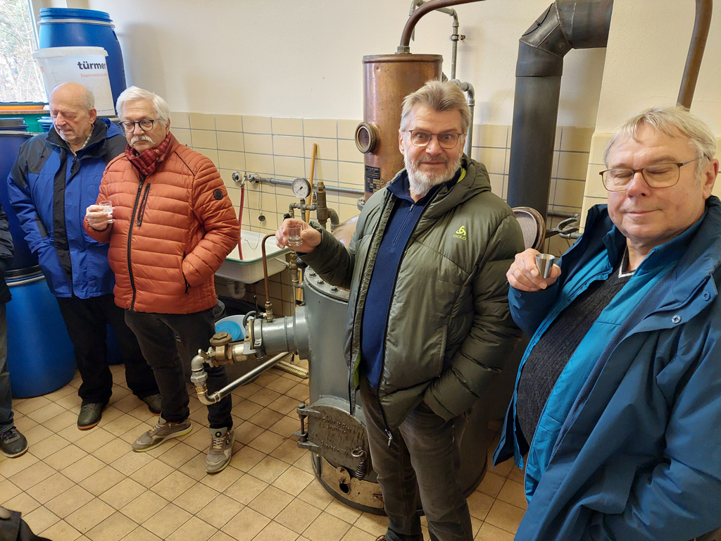 Die Luft war noch voll von den Gerüchen der feinsten Obstbrände. Selbstverständlich durften wir dann auch probieren. So erschmeckten wir, was man Feines aus Zwetschgen, Kirschen und Schlehen machen kann. So vorbereitet ging es zum Mittagessen und da waren wir in der Klostergaststätte genau richtig. Es gibt im Kloster nicht nur gute Obstbrände, sondern auch gutes Essen, und davon reichlich. Leberknödelsuppe, Fleisch, Fisch, Käsespätzle, Salat und Nachspeisen führten dazu, dass die meisten Wanderer nicht mehr zu Fuß den Heimweg antraten, sondern sich von den Autofahrern chauffieren ließen.